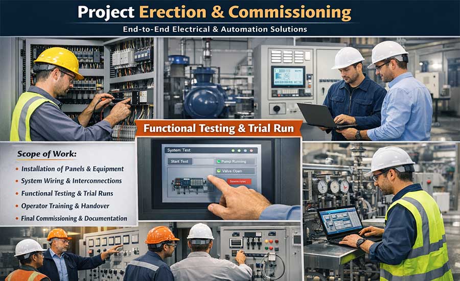 We provide complete Project Erection & Commissioning services to ensure smooth installation, testing, and successful startup of electrical and automation systems. Our expert team handles on-site erection, system integration, functional testing, and final commissioning in compliance with industry standards. By ensuring accurate execution and reliable performance, we help minimize delays, reduce risks, and deliver efficient, ready-to-operate systems for industrial projects.
